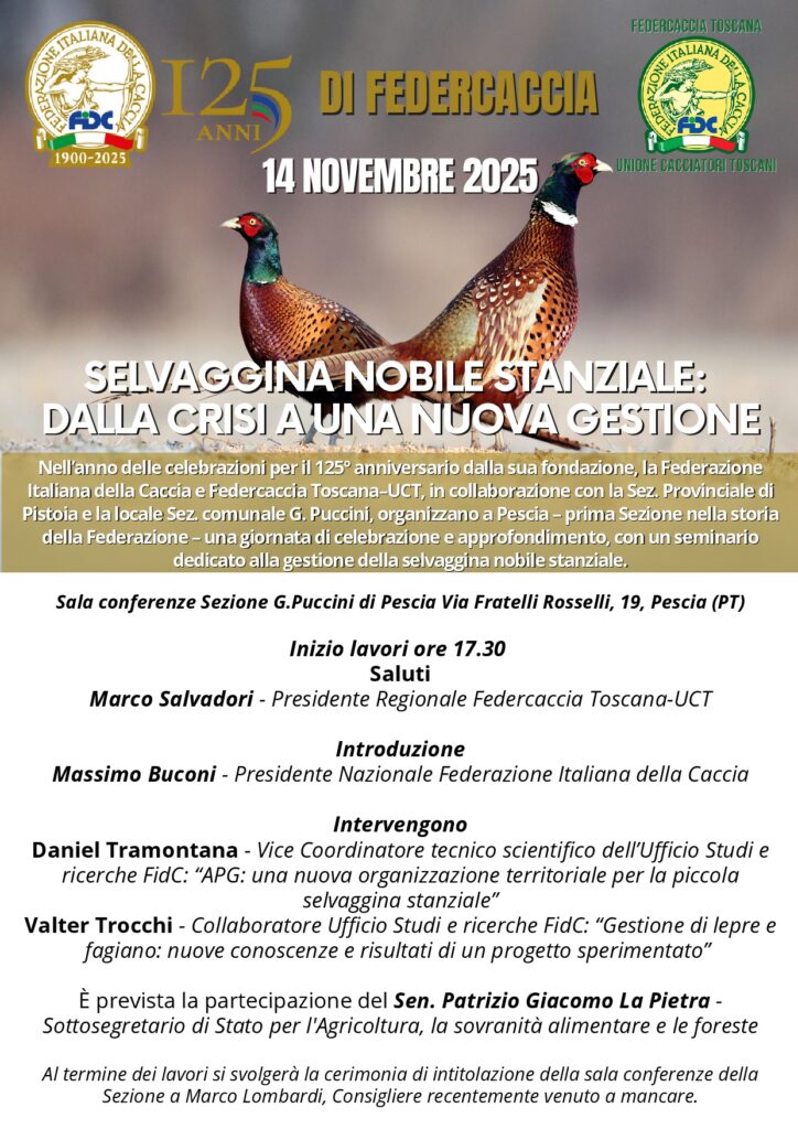 La Federazione Italiana della Caccia e la Federcaccia Toscana – UCT, in collaborazione con la sez. FIdC di Pistoia e la sez. comunale G. Puccini, organizzano venerdì 14 novembre presso la sala conferenze della sezione comunale G. Puccini di Pescia, un incontro sul tema ” Selvaggina Nobile Stanziale: Dalla crisi a una nuova gestione”.