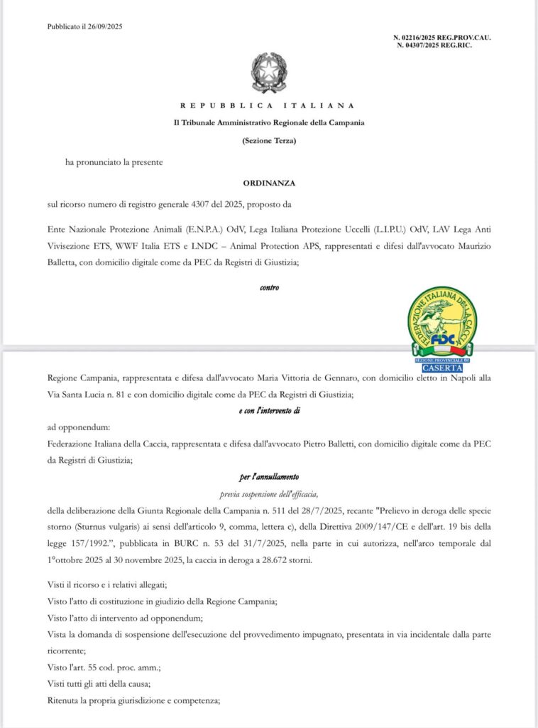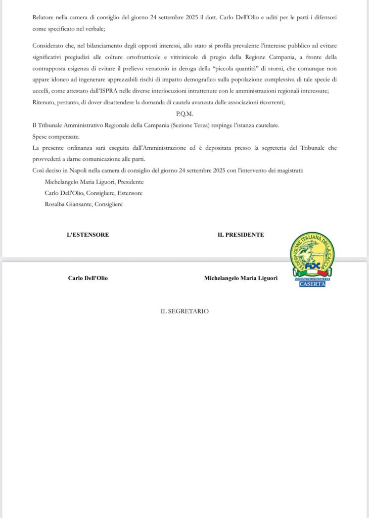 Il TAR Campania respinge il ricorso avverso il prelievo in deroga della specie storno.