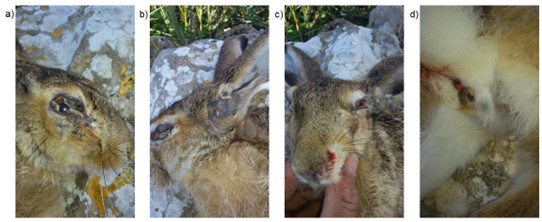 Lepre italica con lesioni da Mixomatosi: in a), b), c) blefarocongiuntivite, in d) lesioni genitali