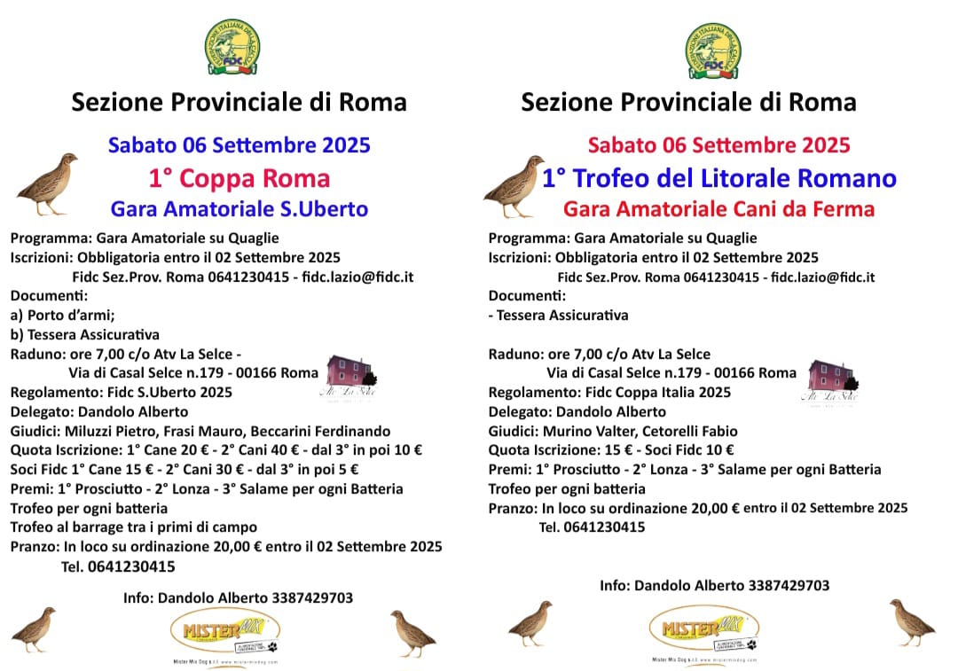 Si tratta della 1^ Coppa Roma, gara amatoriale S.Uberto disputata su quaglie, e il I Trofeo del Litorale Romano, gara amatoriale riservata ai cani da ferma.