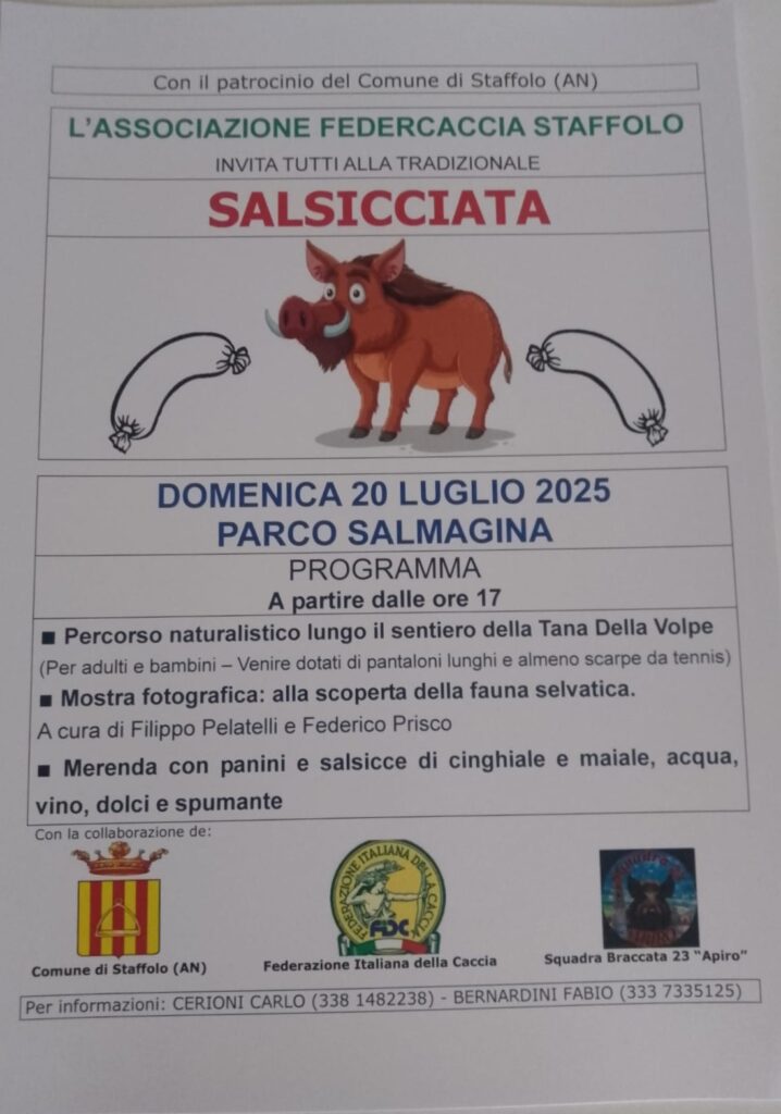 La sezione comunale Federcaccia di Staffolo invita tutti a partecipare domenica 20 luglio alla tradizionale Salsicciata che si svolgerà al parco Salmagina a partire dalle ore 17.
