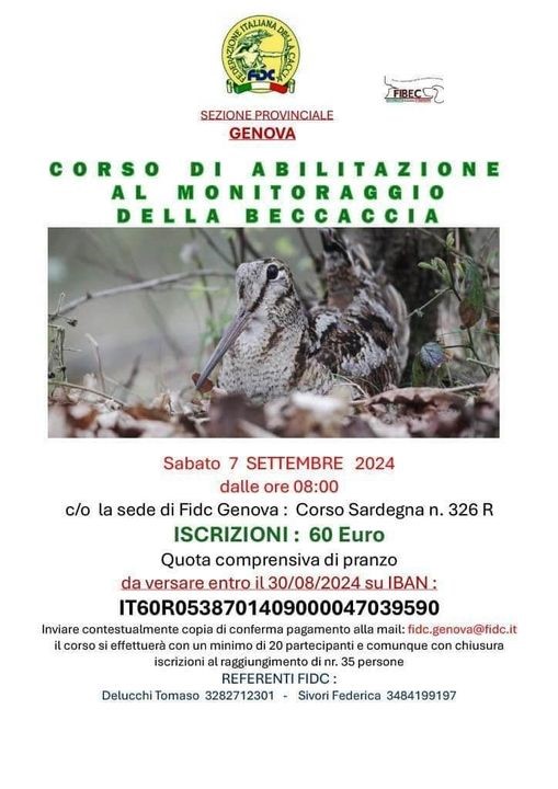 Sabato 7 settembre alle ore 8.00 la sezione provinciale FIdC di Genova organizza presso la sede in Corso Sardegna 326/R, un corso di abilitazione al monitoraggio della beccaccia.