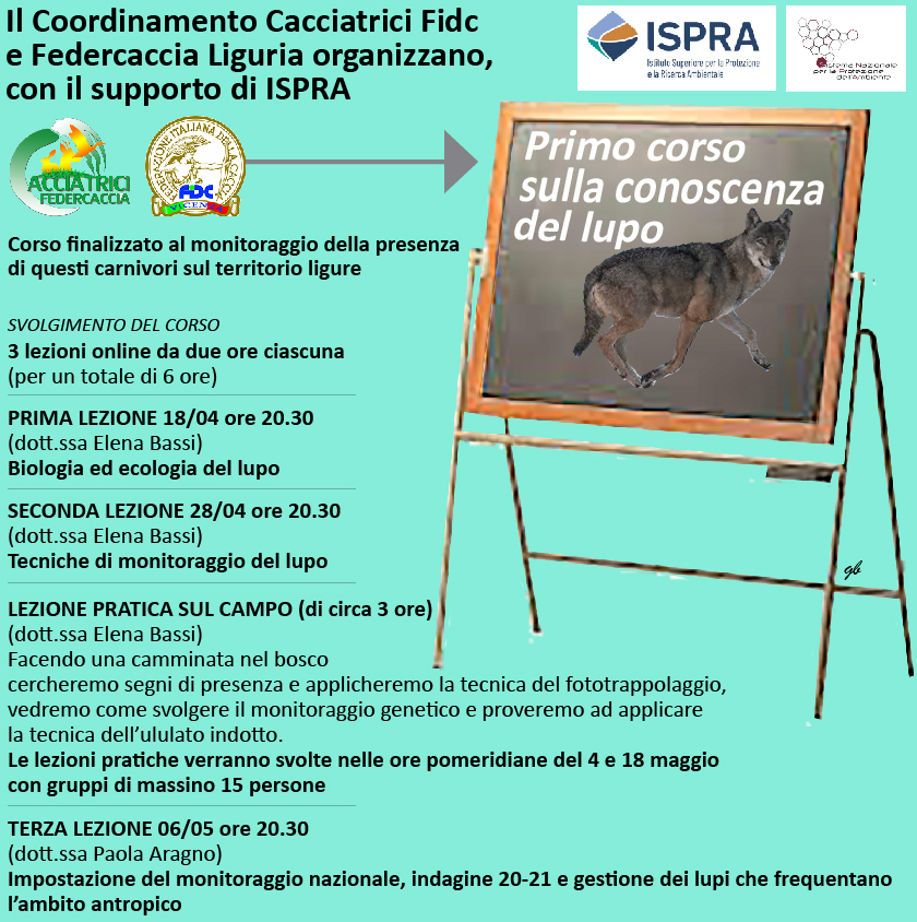 Un corso per insegnare a riconoscere tracce della presenza del lupo sul territorio e formare tra le Federcacciatrici e i Federcacciatori delle vere e proprie “sentinelle” in grado di compilare con precisione un questionario sugli avvistamenti. L’insieme dei dati raccolti servirà per dare un quadro attendibile della presenza di questo carnivoro per ora in Liguria, dove nasce l’iniziativa ad opera del Coordinamento nazionale cacciatrici Federcaccia e FIdC Liguria, in seguito dalle Regioni che vorranno recepirla.