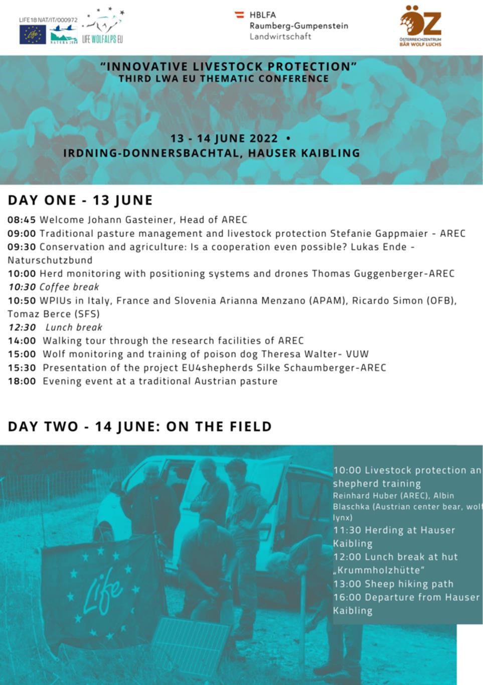La terza conferenza tematica di LWA EU “Innovative livestock protection” si terrà il 13 e il 14 giugno 2022 in Austria presso il partner di progetto AREC (HBLFA Raumberg-Gumpenstein) – Seminarraum Schloss, Altirdning 11, 8952 Irdning-Donnersbachtal, Hauser Kaibling.